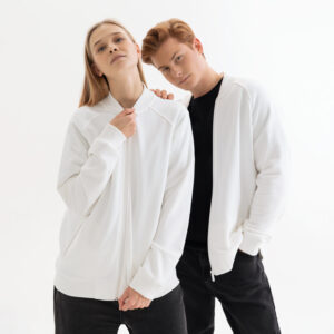 Универсальная толстовка с воротником-стойкой и заниженной линией плеча. По нижнему краю и на рукавах — эластичные резинки для комфортной и аккуратной посадки. Модель застёгивается на металлическую молнию.