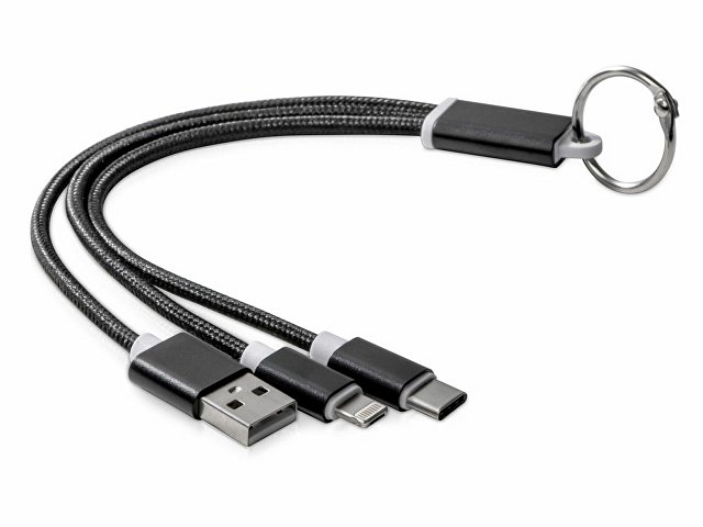 Кабель для зарядки «Tres» 3-в-1 с брелоком, коннекторами 1 type с, 1 USB type A и двойным совместимым коннектором «2-в-1» для устройств с ОС Apple® iOS и Android. В комплект входит брелок. Для зарядки устройств Apple подключайте кабель стороной без контактов; для зарядки устройств с ОС Android подключайте кабель стороной с контактами. Алюминий.