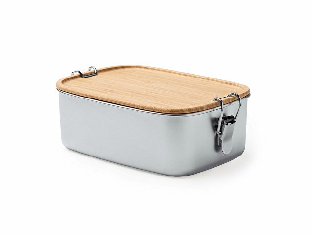 Ланч-бокс из нержавеющей стали 304 с бамбуковой крышкой с системой закрытия с помощью боковых пряжек. Большая емкость 1 л для хранения продуктов.