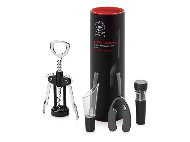 В винном наборе «Pinot Grigio» собрано все, что необходимо для откупоривания, подачи и длительного хранения вина. Аксессуары поставляются в эффектном красном тубусе и брендированном шубере.