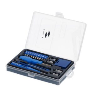 Набор из 25 инструментов включает измерительную мини рулетку, крестообразную отвертку, плоскую отвертку, 9 насадок с адаптером (4 крестообразных шлицев, 2 плоских шлица и 3 шестигранных шлица), 3 шестигранных ключа, 5 головок (5-9 мм), острогубцы, рукоятку отвертки, адаптер для насадок и удобный футляр.