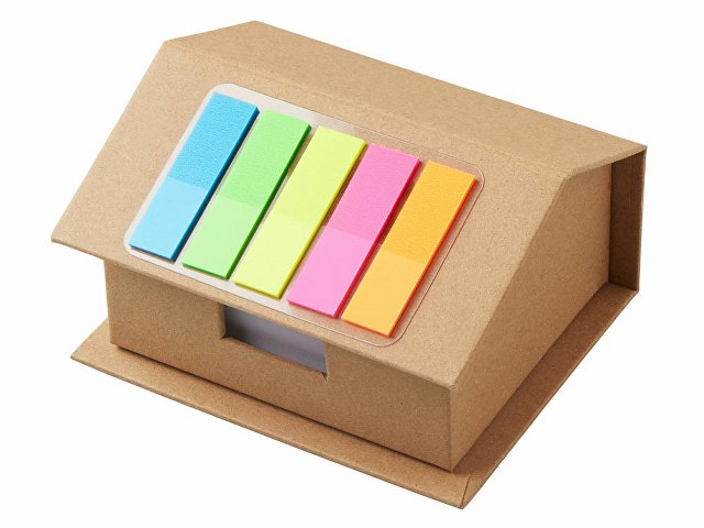 Набор стикеров и бумаг для записи в виде домика. На крыше домика расположены стикеры, 5 цветов по 25 штук каждого цвета. Внутри домика — 400 листов белой бумаги для записей плотностью 70 г/м2.