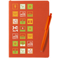 блокнот — искусственная кожа, коробка — переплетный картон, ручка — пластик