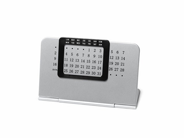 «Вечный» настольный календарь, состоящий из двух частей: одной серебряной подставки с числовой панелью и черной выдвижной рамки с днями недели на испанском и английском языках.