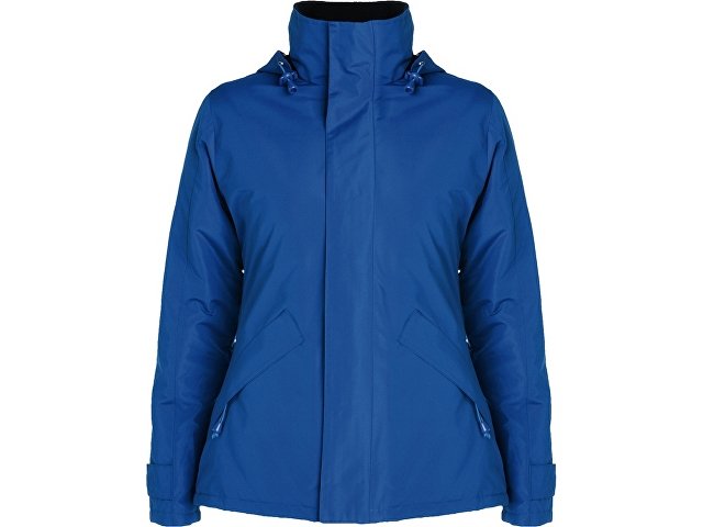 Парка прилегающего силуэта с высоким воротом застегивается на молнию в тон: