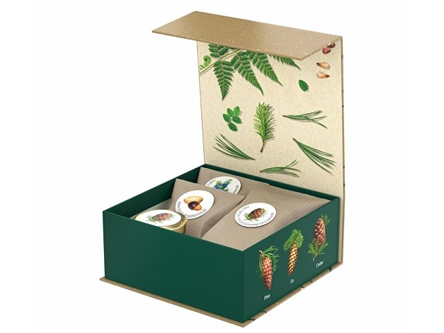 Аромат и вид хвои – символ Рождества и Нового года. «Хвойная» шкатулка «С сосновым годом!» оформлена праздничным паттерном и изображением шишек разных хвойных деревьев. На крышке шкатулки помещена иллюстрация, изображающая вид снизу вверх на звёздное небо и уходящие ввысь сосны. При надевании на шкатулку шубера (суперобложки) с круглым отверстием, на крышке шкатулки появляется вырубное изображение новогоднего шарика.