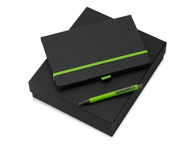 блокнот — искусственная кожа, бумага, ручка — металл с покрытием софт-тач, коробка — кашированный картон