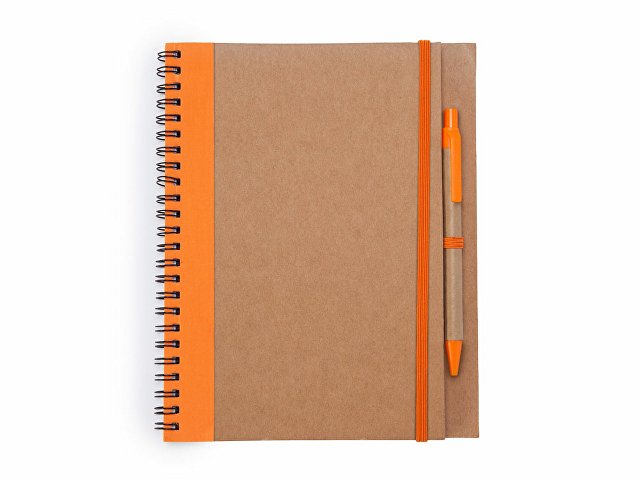 Блокнот на спирали с жесткой обложкой из переработанного картона. Включает шариковую ручку с синими чернилами. 60 простых листов.