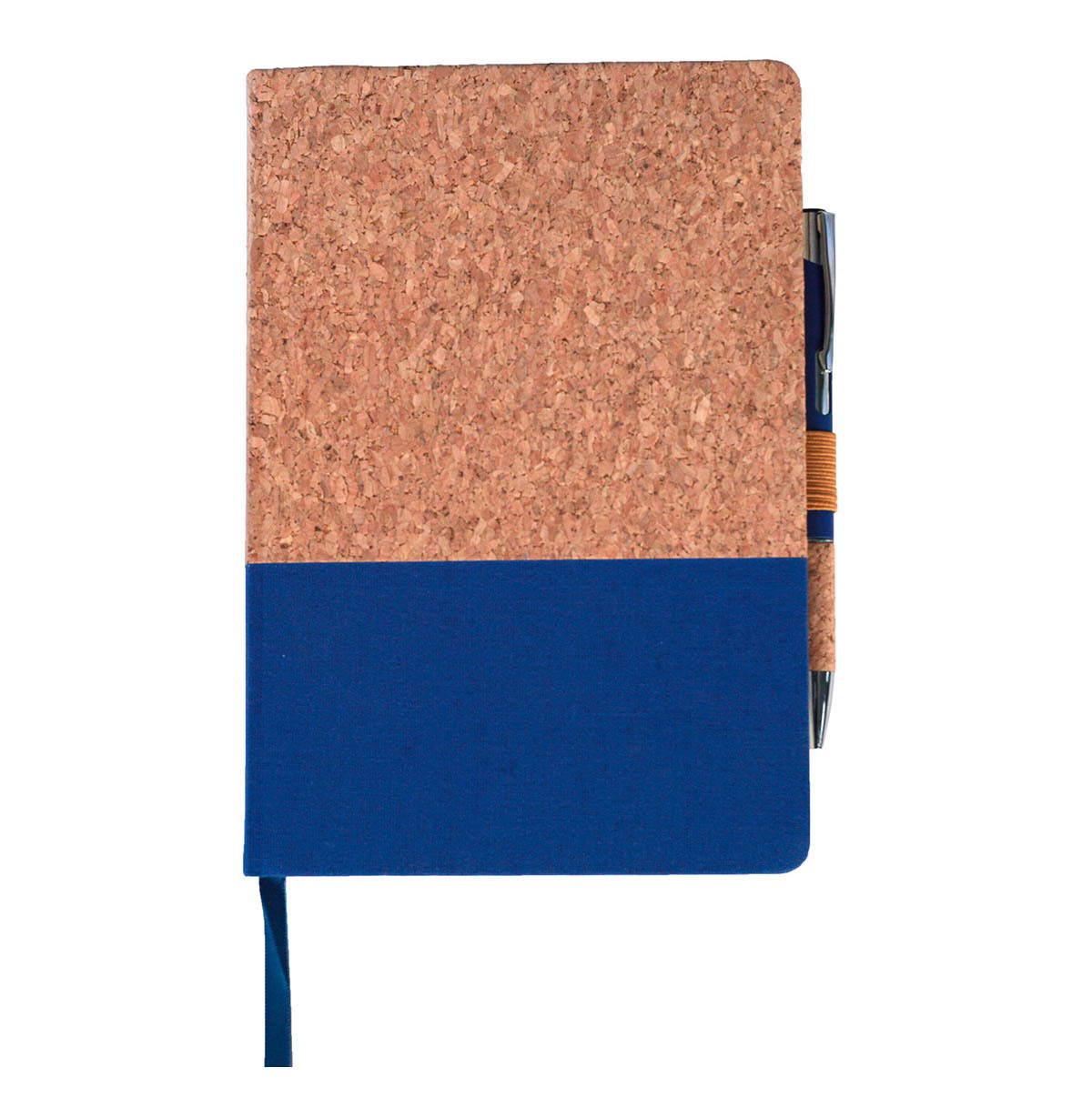 Формат: А5; Твердый переплет; Материал: Пробка/полиэстер; Пробковый блокнот в комплекте с шариковой ручкой. Обложкая из пробки с крупнозернистой фактурой с вставкой из цветного полиэстера. Блок из бежевой бумаги 80 листов разлинованная с планировщиком дня. Шариковая ручка с нажимным механизмом подачи стержня, паста синяя. Корпус ручки из алюминия с soft touch покрытием и с пробковой вставкой. Стержень в ручке заменяемый.