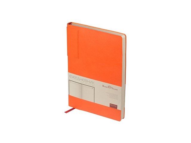 Лаконичная модель в ярком исполнении: гибкая обложка оранжевого цвета с контрастной или в цвет обложки нашивкой. Выполнен из качественной и прочной искусственной кожи, крепление внутреннего блока — книжный переплет, закладка- ляссе. Углы обложки скруглены.