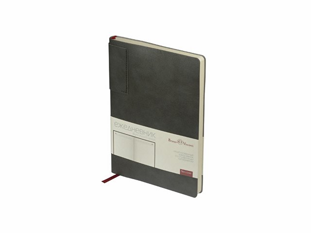 Лаконичная модель в ярком исполнении: гибкая обложка серого цвета с контрастной или в цвет обложки нашивкой. Выполнен из качественной и прочной искусственной кожи, крепление внутреннего блока — книжный переплет, закладка- ляссе. Углы обложки скруглены.
