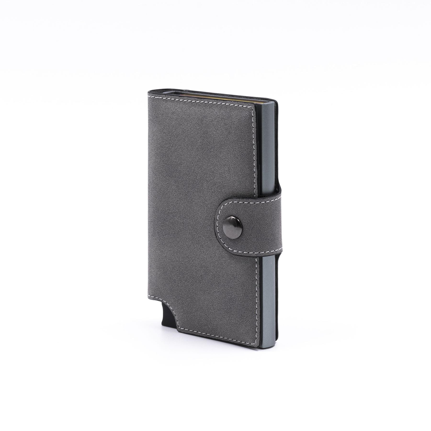 Компактный картхолдер изготовлен из веганской замши и алюминия с функцией RFID-защиты и механизмом для быстрого доступа к картам. Вмещает до 9 карт стандартного формата, оснащен эластичной лентой для наличных.
