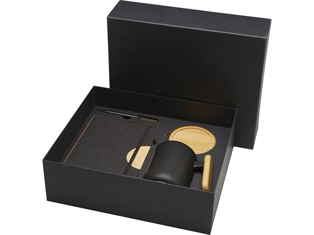 В подарочный набор Laura входит блокнот в твердой обложке RPET формата A5, шариковая ручка, керамическая кружка и подставка. Блокнот имеет черную эластичную застежку и ленточную закладку, а также 80 разлинованных листов бумаги плотностью 80 г/м² кремового цвета. Чехол для ноутбука вместе с бамбуковым полукругом выполняет функцию подставки для телефона. Шариковая ручка изготовлена из переработанного алюминия, сертифицированного RCS, с черным напылением и имеет бамбуковые аксессуары с обеих сторон верхнего корпуса. Чернила для ручки: черный. Длина непрерывной линии: 400 метров. Керамическая кружка объемом 480 мл поставляется с бамбуковой подставкой. Мыть только вручную. Размер кружки: 11 х 12,7 см. Диаметр подставки: 9,5 см. Размер подарочной коробки: 32 x 27 x 10,3 см. FSC certified paper, FSC certified cardboard, Recycled Aluminium. #?0:>2:0: FSC Mix Credit P5.1 CU-COC-877277. FSC Mix Credit P7.1 CU-COC-877277.