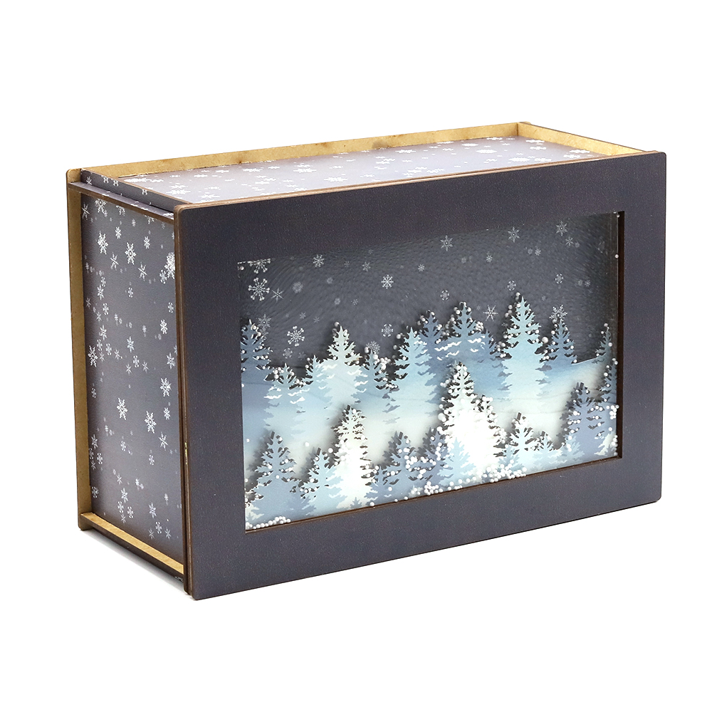 Новогодняя упаковка «Лес в снегу» — это прямоугольная деревянная коробка темного цвета, оформленная в зимнем лесном стиле с изображением снежных деревьев. Её элегантный и атмосферный дизайн создаёт ощущение зимней сказки, делая её идеальной для хранения подарков или сладостей. Отличается стильным внешним видом и добавляет праздничное настроение в новогодние торжества.