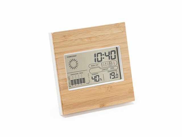 Метеостанция с лицевой стороной из бамбука. Часы, календарь и функция будильника с датчиками температуры и влажности. Запись максимальной и минимальной температуры и влажности. Работает от 2 батареек типа ААА (не входят в комплект).