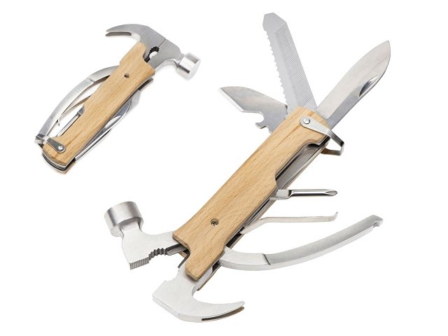 Многофункциональный инструмент, который выручит дома, на даче, в путешествии, походе и во множестве других ситуаций. Полностью сделан из металла и декорирован накладками из натурального дерева. Чехол в комплекте.