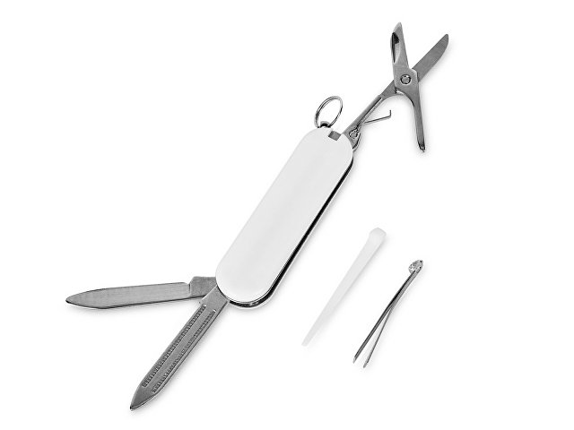 Складной нож в пластиковом глянцевом корпусе. Можно удобно прикрепить на ключницу. В комплект входят: — Ножницы — Нож — Пилочка — Щипцы — Шило