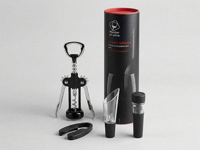 В винном наборе «Pinot Grigio» собрано все, что необходимо для откупоривания, подачи и длительного хранения вина. Аксессуары поставляются в эффектном красном тубусе и брендированном шубере.
