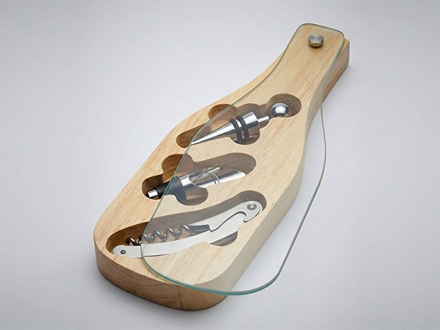 Деревянная часть футляра имеет три вырезанные ниши под каждое из приспособлений для вина, дополненные выемками под пальцы для удобного извлечения.