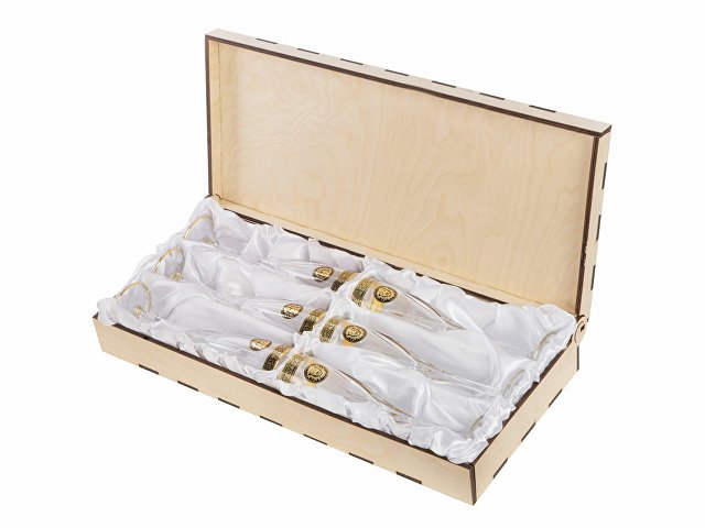 Оригинальный набор бокалов для шампанского, задекорированных золотистым изображением царя зверей – могучего льва. Бокалы выполнены из прозрачного хрусталя с золотистой отделкой по краю и на ножке. Набор рассчитан на 6 персон. Упакован в деревянную коробку.