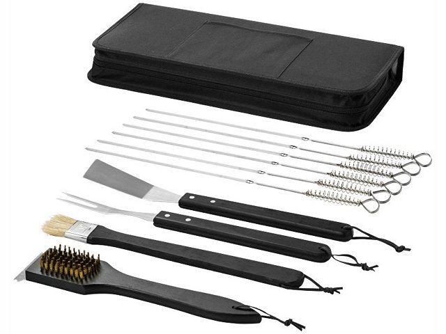Набор для барбекю «Asado» из 11 предметов. Набор для барбекю включает лопатку для рыбы, кисть, вилку и щетку для очистки с деревянными ручками, шесть шампуров и чехол на молнии с передним карманом для нанесения. Нанесение не предлагается на отдельные элементы набора. Нержавеющая сталь и полиэстер 600D.