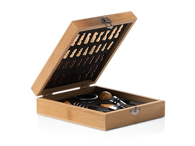 Винный набор с аксессуарами из нержавеющей стали и бамбука. Представлен в бамбуковом футляре с шахматным рисунком. Мягкая внутренняя отделка. В комплекте игровые фишки и 4 аксессуара: штопор, дозатор, крышка и кольцо для сбора капель. Поставляется в экологичной дизайнерской коробке.