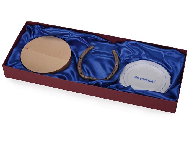 В набор входят: кусок дерева, для того чтобы постучать по деревянному и отвести неприятности, настоящая подкова победителя скачек, тарелка «На счастье»
