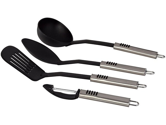 Кухонный набор из 4 предметов. Облегченный набор из четырех предметов включает чистильный нож, ложку, лопатку для сковороды и половник. Отверстия в ручках — для возможности повесить в кухне. Набор упакован в коробку Paul Bocuse. Нержавеющая сталь и нейлон.