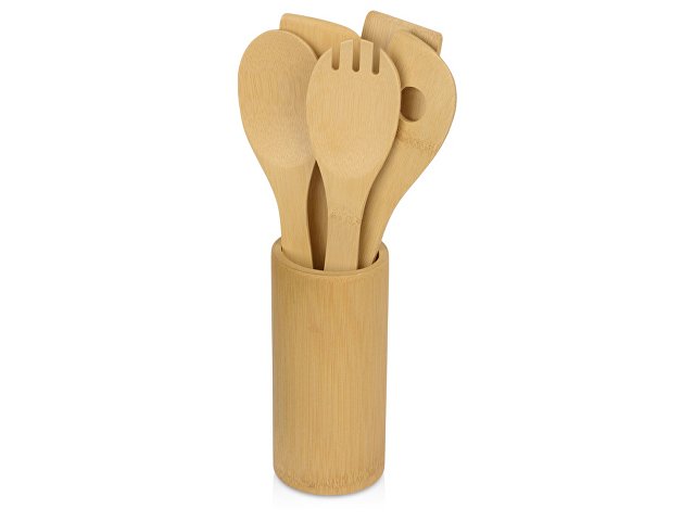 В набор входят лопатки и ложки, необходимые для приготовления различных блюд. С помощью удобной подставки из бамбука, которая идет в комплекте, принадлежности всегда будут под рукой.