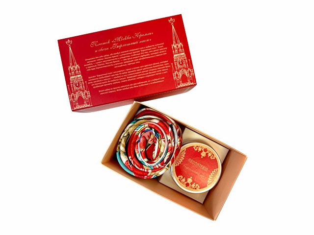 Платок «Кремль – Москва» в шелке воплощает шедевр ювелирного искусства Карла Фаберже из серии подарков для русской императорской семьи. В центре полотна расположен Успенский собор в обрамлении башен Московского Кремля. Утонченный рисунок, яркое цветовое решение и глубокий символизм дизайна платка созданы для эффектного акцента праздничного образа.