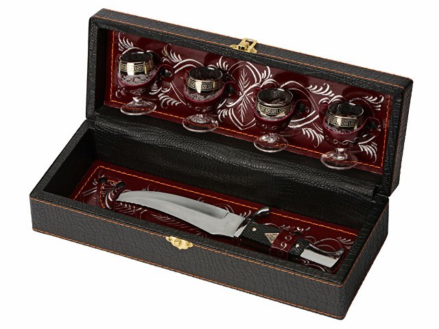 Шкатулка-футляр — хороший подарок, особенно, если в ней достойное содержание. Например, набор рюмок на 4 персоны и нож для закуски. Отдельно такой набор дарить не солидно — не красиво преподносить стопки без упаковки, а пустая шкатулка только разочарует — открывая такую красоту, всегда ждешь внутри что-то чудесное.