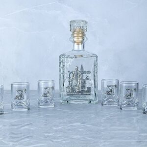 Подарочный набор со штофом «Энергетики». Традиционная для русского человека комплектация: элегантный графин емкостью 700 мл. с оловянным барельефом «ЭНЕРГЕТИК» и 6 стопок емкостью 50 мл. с оловянным барельефом «Опора ЛЭП». Материал барельефов: сплав с содержанием олова не менее 95%(пьютер). Художественное литье,чернение с эффектом антикварного серебра,полировка. Ручная работа. Подарочная упаковка «люкс» с атласным ложементом.