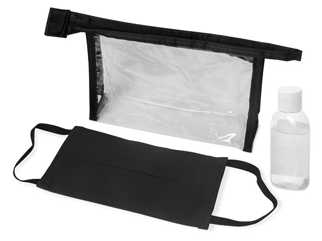 Самое необходимое всегда под рукой — в любом месте и при любой ситуации. Многоразовая хлопковая маска черного цвета и антисептик в стильной пластиковой косметичке поместятся в любой сумке.