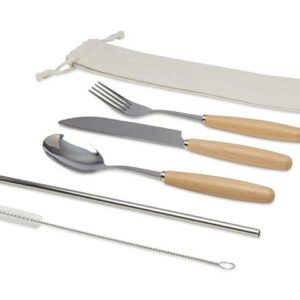 Набор столовых приборов из нержавеющей стали в практичном неопреновом футляре. Включает в себя вилку, нож и ложку, идеально подходящие для того, чтобы брать их с собой куда угодно.