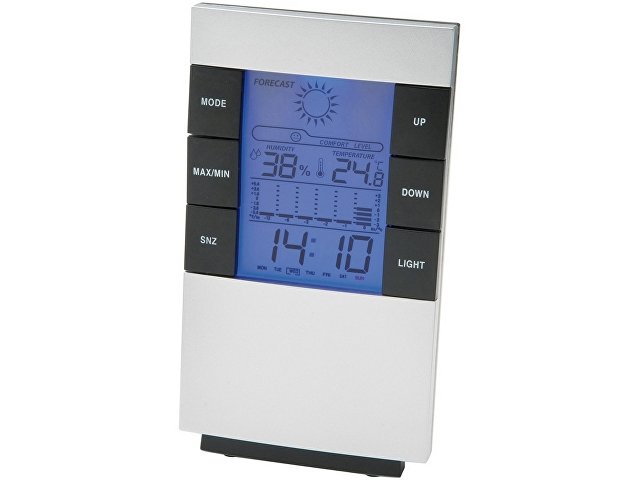 Настольная метеостанция с будильником с повторением сигнала, с указанием даты и дня недели, подсветкой, термометром в градусах по Цельсию и Фаренгейту, гигрометром и прогнозом погоды. Требуются 2 батарейки размера AAA (не включены в комплект). Пластик.