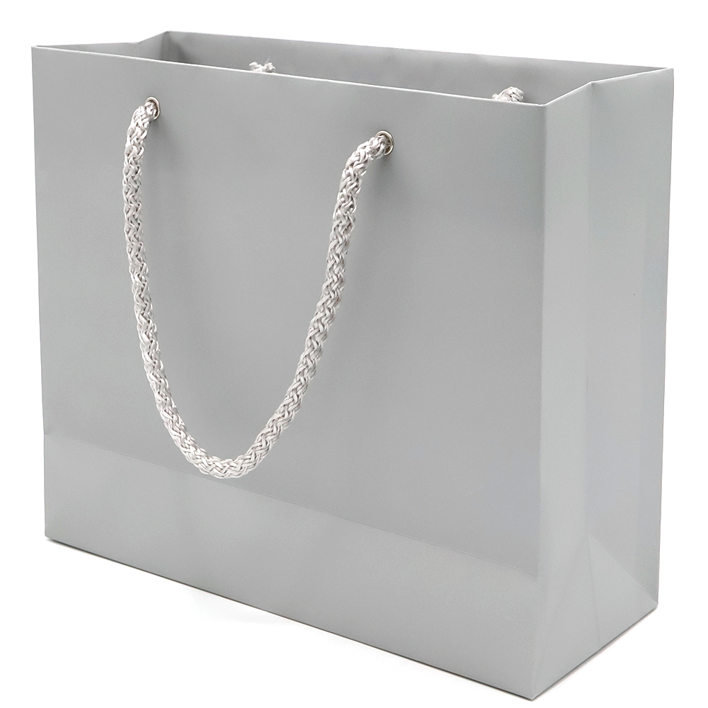 Бумажный цветной пакет плотностью 170 г/м². Покрытие софт-тач. Шнур 6 мм серого цвета. Люверс — серебристый.