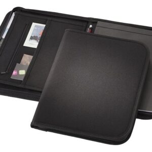 Папка с ручкой, застежкой-молнией, регистратором, карманом на молнии и отделениями для документов. Включает блокнот А4 с 20 страницами линованной бумаги. Ручка и принадлежности не включены.