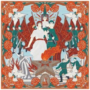 Сказочный вид собора отражен на золотом фоне новинки от бренда «Русские в моде» by Nina Ruchkina. Настоящее восьмое “чудо Света” обрамлено царскими коронами и райскими птицами, свидетельствующими об уникальности и роскоши этой исторической достопримечательности, отстроенной 1 октября 1552 года на праздник Покрова Богородицы.