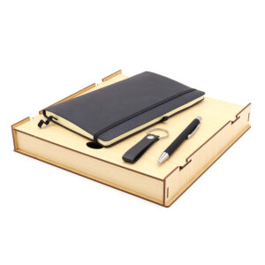 Подарочный набор в стильной цветной картонной коробке черного цвета (крышкой-дно). Внутри на аккуратном ложементе располагаются ежедневник А5 и вечный карандаш с шариковой ручкой.
