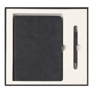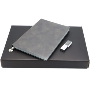 Подарочный набор в стильной цветной картонной коробке черного цвета (крышкой-дно). Внутри на аккуратном ложементе располагаются блокнот, ручка c корпусом из бамбука, и вечный карандаш.