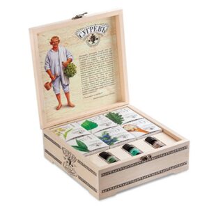 Подарочный набор из семи эксклюзивных купажей листового чая, характерных для разных регионов России и елки ручной работы с натуральным вареньем, в сувенирной шкатулке из массива берёзы.