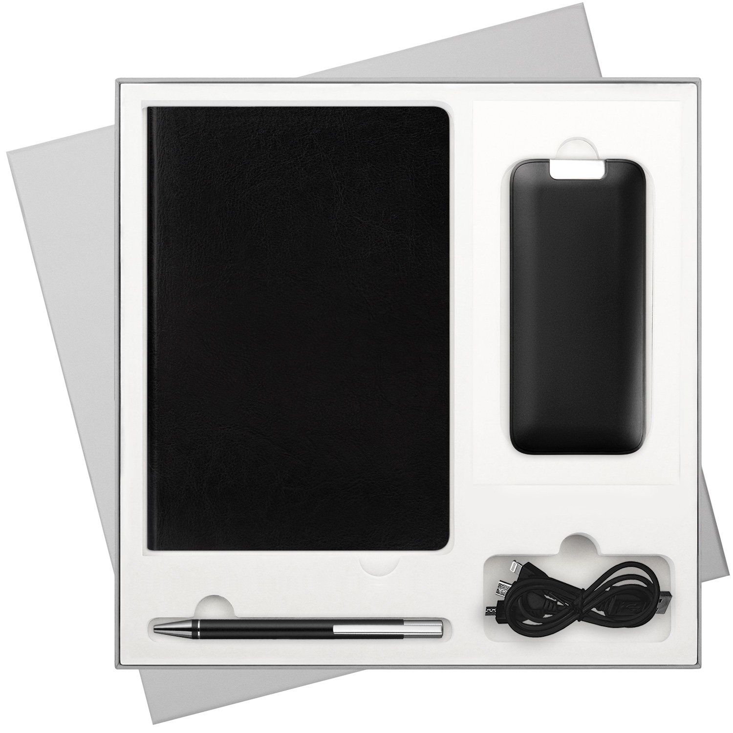 В комплекте: стильный ежедневник для планирования и любых записей, ручка для комфортного письма и внешний аккумулятор, который позволит оставаться на связи в любой ситуации.