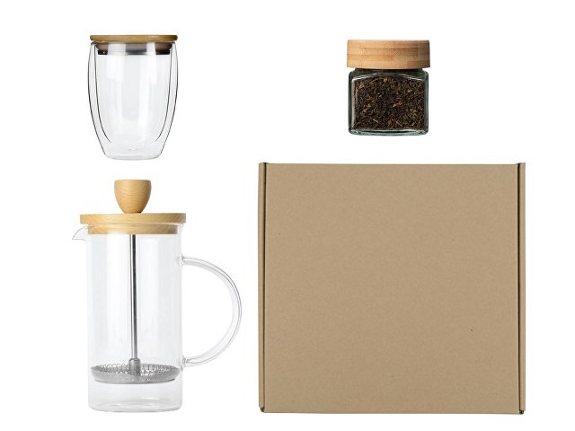 | Материал | френч пресс — боросиликатное стекло, буковое дерево, нержавеющая сталь 304 марки, чай — банка -стекло, крышка- дерево, стакан — боросиликатное стекло, бамбук, нержавеющая сталь, коробка — картон |