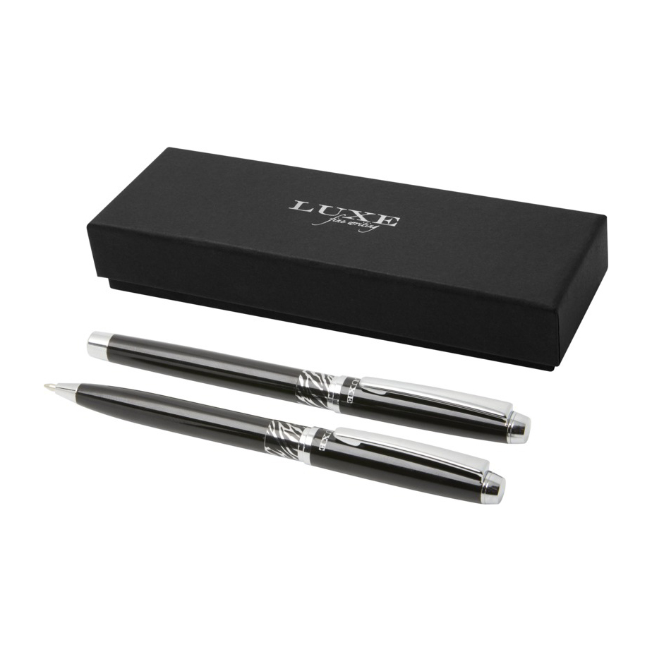 Шариковая ручка и ручка-роллер с декоративным узором на корпусе. Шариковая ручка предварительно заполнена синими чернилами, а ручка-роллер предварительно заполнена черными чернилами. Упакована в подарочную коробку LUXE. Латунь.