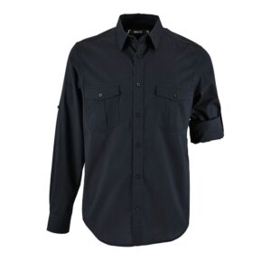 Рубашка из ткани «Оксфорд». Вытачки на груди, классический воротник, регулируемые закругленные манжеты, планка с семью пуговицами в тон.
