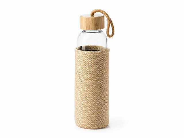 Стеклянная бутылка с оригинальным чехлом, имитирующим джут, и бамбуковой крышкой с практичной ручкой для переноски. Емкость 500 мл.