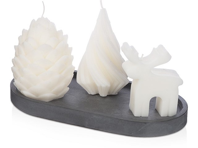 В набор входят три свечи на подставке — неотъемлемые символы Нового года и Рождества — это сосновая шишка, рождественский олень и, конечно же, елка, как главный символ нового года!